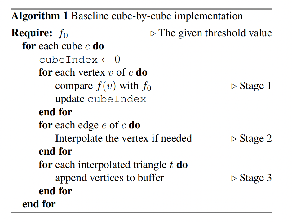 During the implementation of level-by-level method, we also need to make some important optimization decisions. The first one is to use the format of indexed mesh as the output which is more compact. Each interpolated vertex position will be stored exactly once, and each triangle is identified by 3 indices. The second critical change is to replace the most costly branches needed during triangle assembling stage with arithmetic operations and look-up tables.