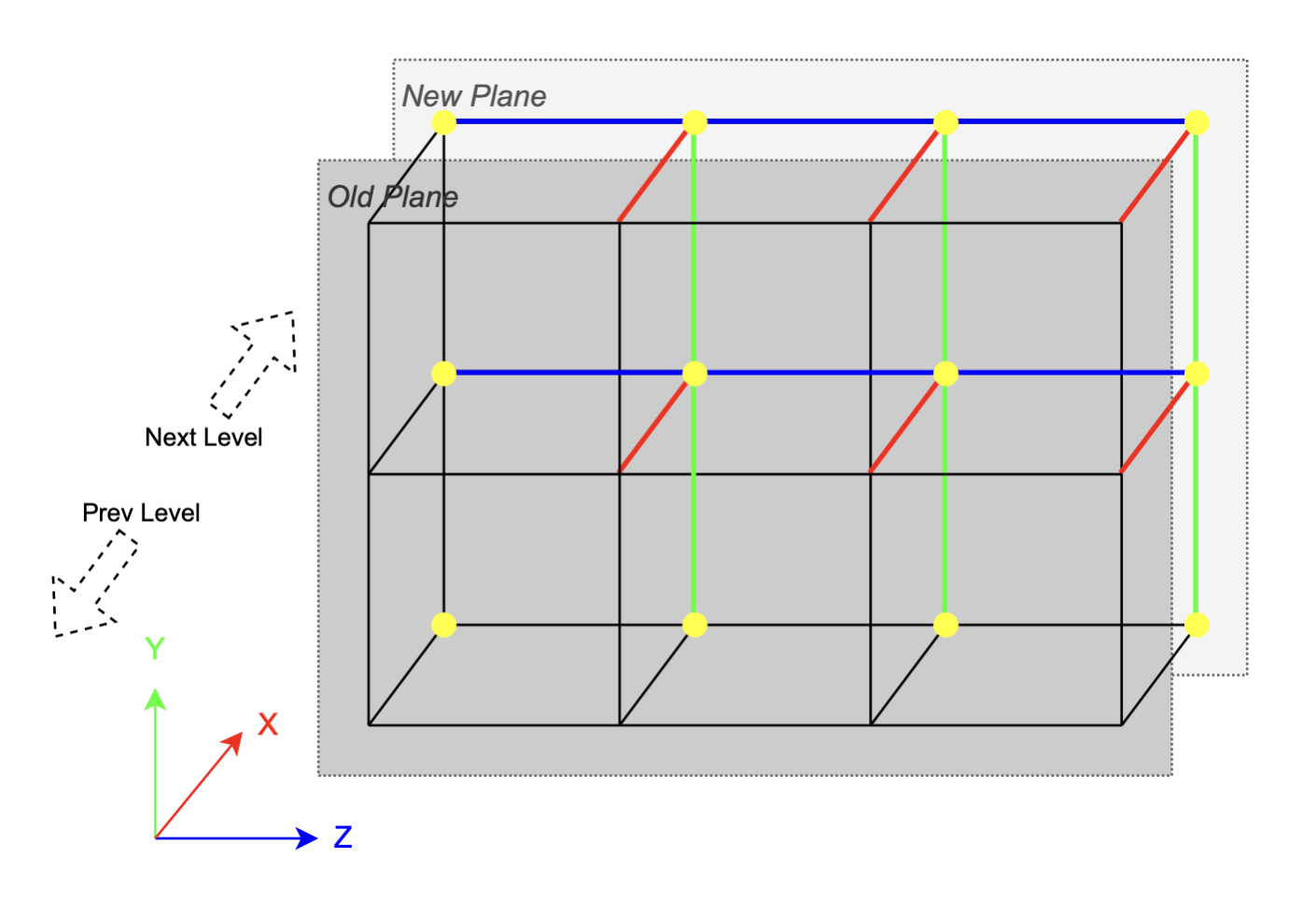 Here is an illustration of the level-by-level optimization. The current level of cubes contact with its two neighbors on two planes. When iterating over the current level, most cubes only need to do the vertex interpolation on 3 edges (colored with colors corresponding to the axes). Threshold comparison and vertex interpolation (on YZ edges) results are only written on the new plane, while the results on the old plane is inherited from previous level. Two ping-pong buffers are used, each one serves for a plane and alternate for odd and even levels. By marching through all the levels we could process all cubes without any redundancy.