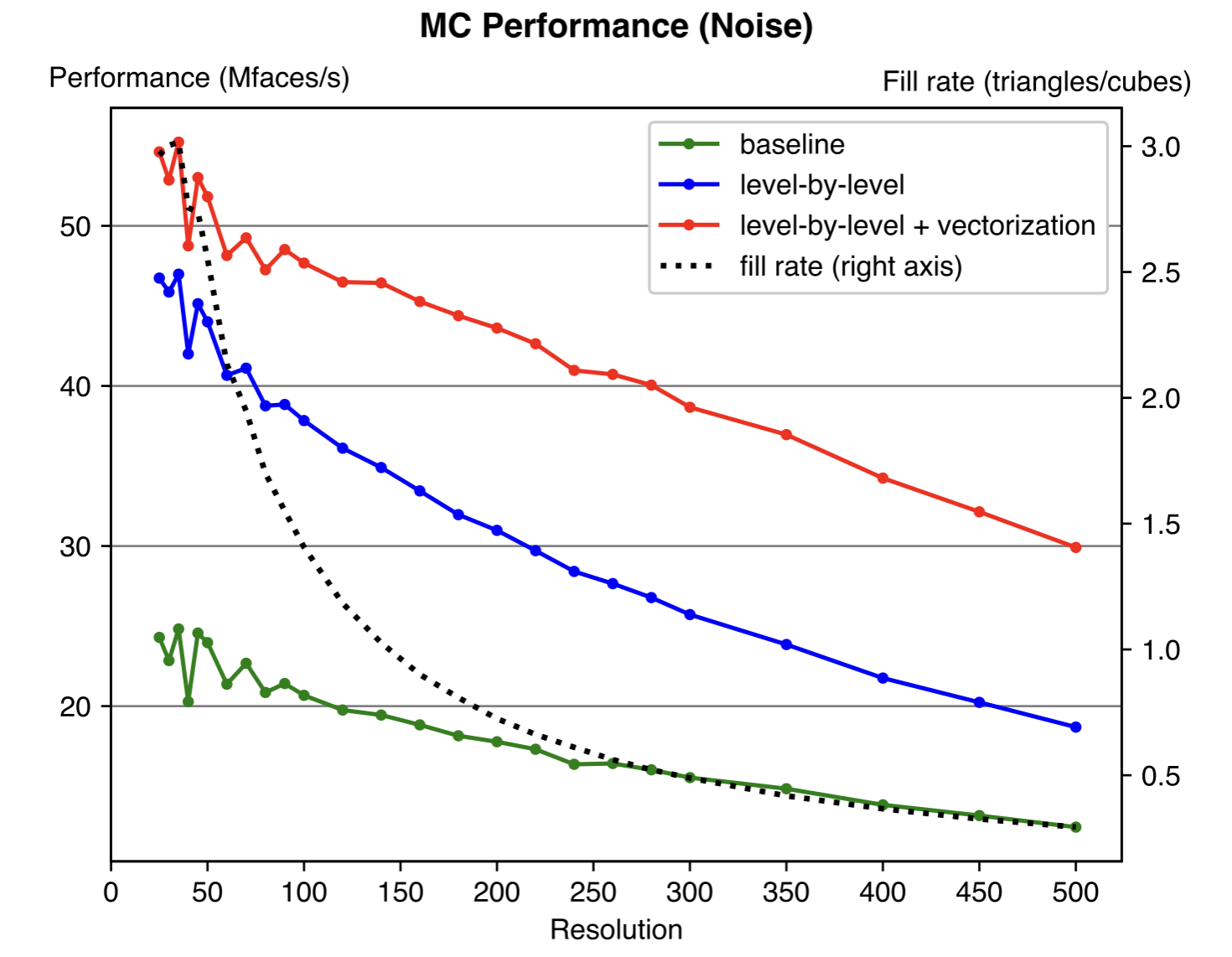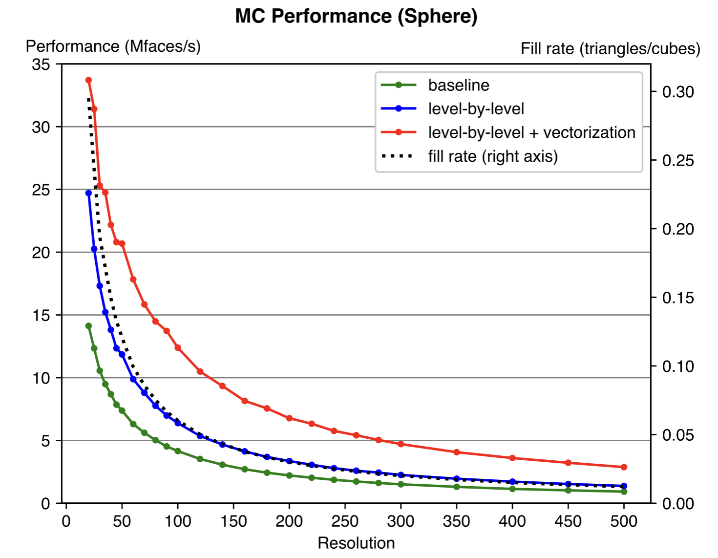 Experiment results show that our optimization could achieve 2-3x speedup compared to the naive implementation. The optimization proposed is general and should be effective for any resolution and specific values of the input data. The fixed cost of the algorithm depends on the number of cubes, while the variable cost depends on the number of triangles generated. Thus, we also plot the “fill rate” in the figure (value on right axis), which is defined as the ratio of the number of triangles to the number of cubes (resolution cubed).