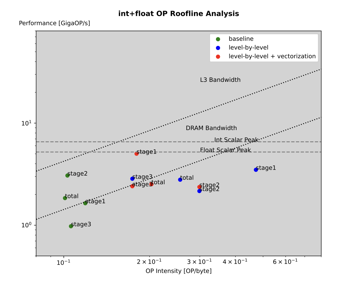 Roofline analysis. We can see the improvement on operational intensity compared to the baseline. This is mainly because the level-by-level strategy reduces memory access of the redundant computation. The vectorization mainly happens in the first stage, and its performance gain could be clearly spotted in the plot.