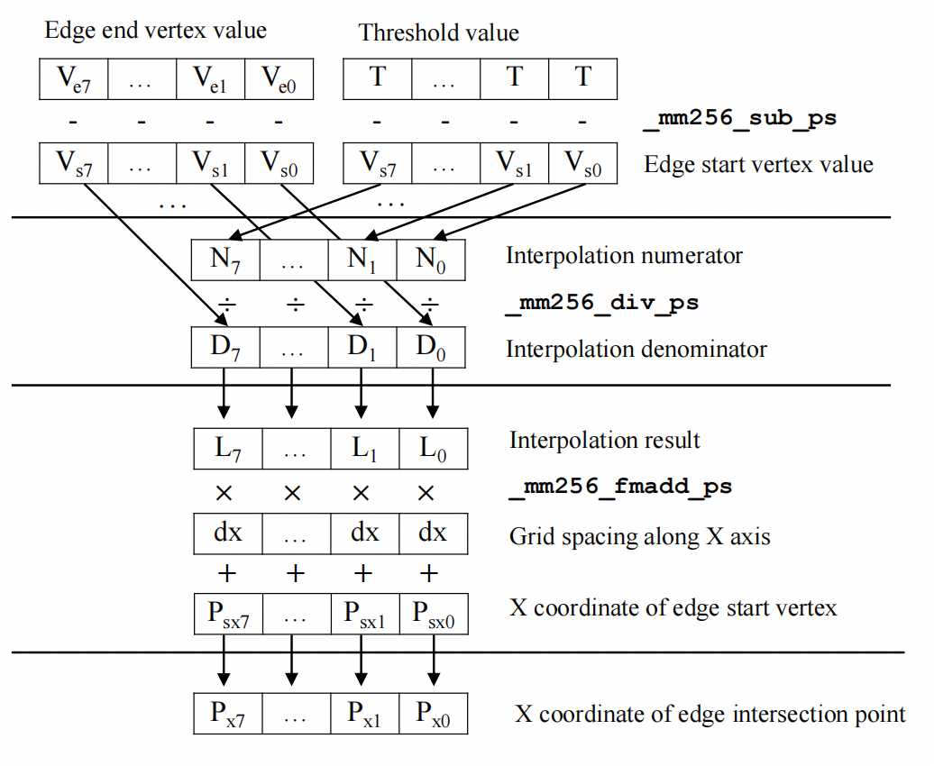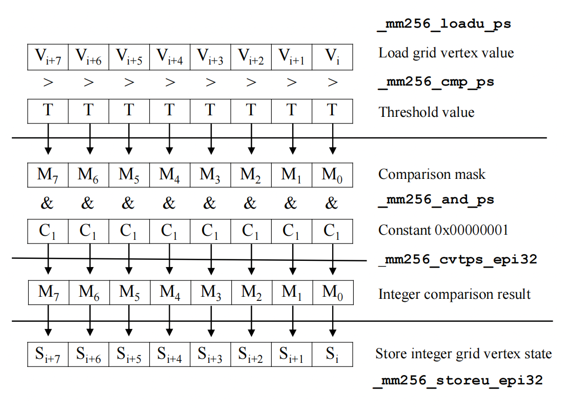 On the basis of the level-by-level method, we can integrate the SIMD vectorization into it. AVX2 intrinsics to vectorize the comparison of grid point values and the threshold, the determination of cube topology and the interpolation of new edge vertices.