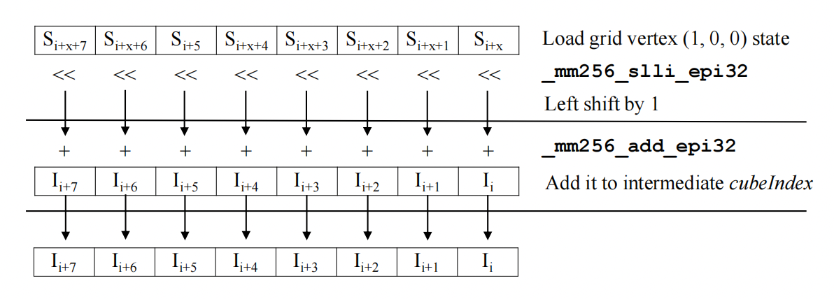 The first bottleneck lies in the vertex interpolation stage. We need to decide which edges are intersecting with the isosurface using “if” statements, increase a global counter of vertex indices which is strictly order-dependent and then store it to the corresponding intermediate array. The “if” branches cannot be predicted, and ILP is difficult to increase with loop unrolling because of the global counter. The cost of actual interpolation is trivial compared to the overhead of branches and the computing and storing of the vertex indices.