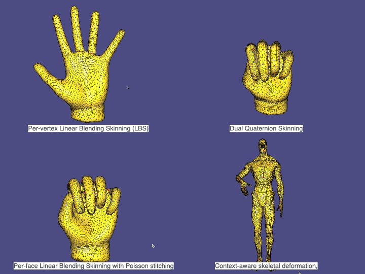 • Context-aware skeletal deformation, where multiple example poses are provided to improve the deformation